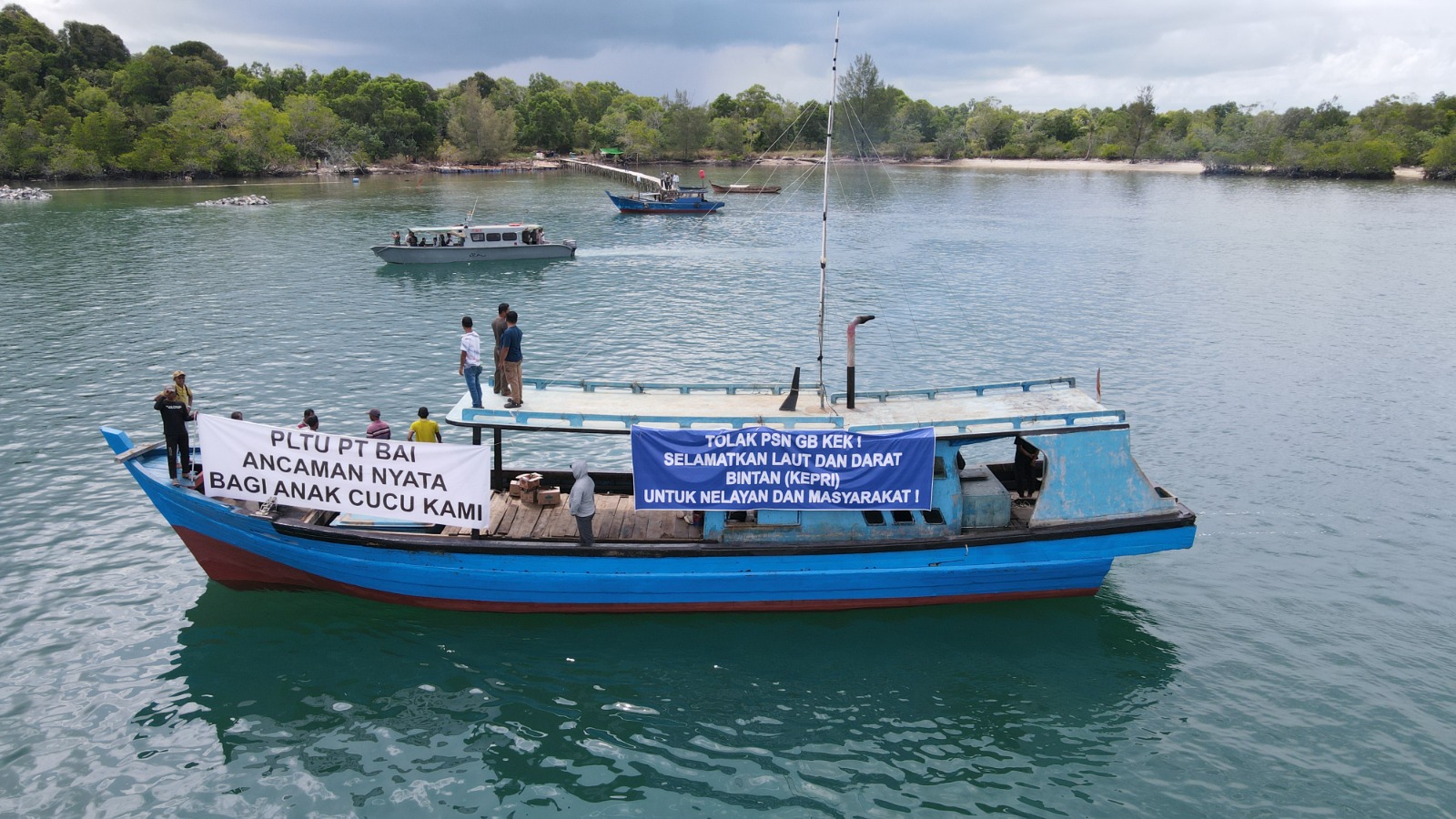 Masyarakat menyampaikan tuntutan mereka melalui spanduk penolakan bertuliskan “Tolak PSN GBKEK! Selamatkan Laut dan Darat Bintan Untuk Nelayan dan Masyarakat” dan “Tolak PSN GBKEK! Selamatkan Ruang Hidup Rakyat”.
