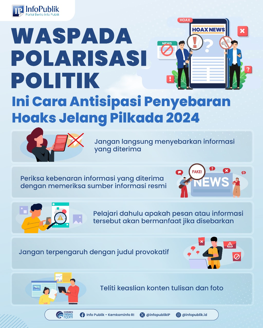 Zonakepri.com – Upaya antisipasi penyebaran hoax jelang Pilkada 2024, yang sering digunakan untuk memecah belah dan memengaruhi opini publik, sehingga penting bagi setiap warga untuk lebih selektif dalam menerima dan menyebarkan informasi.