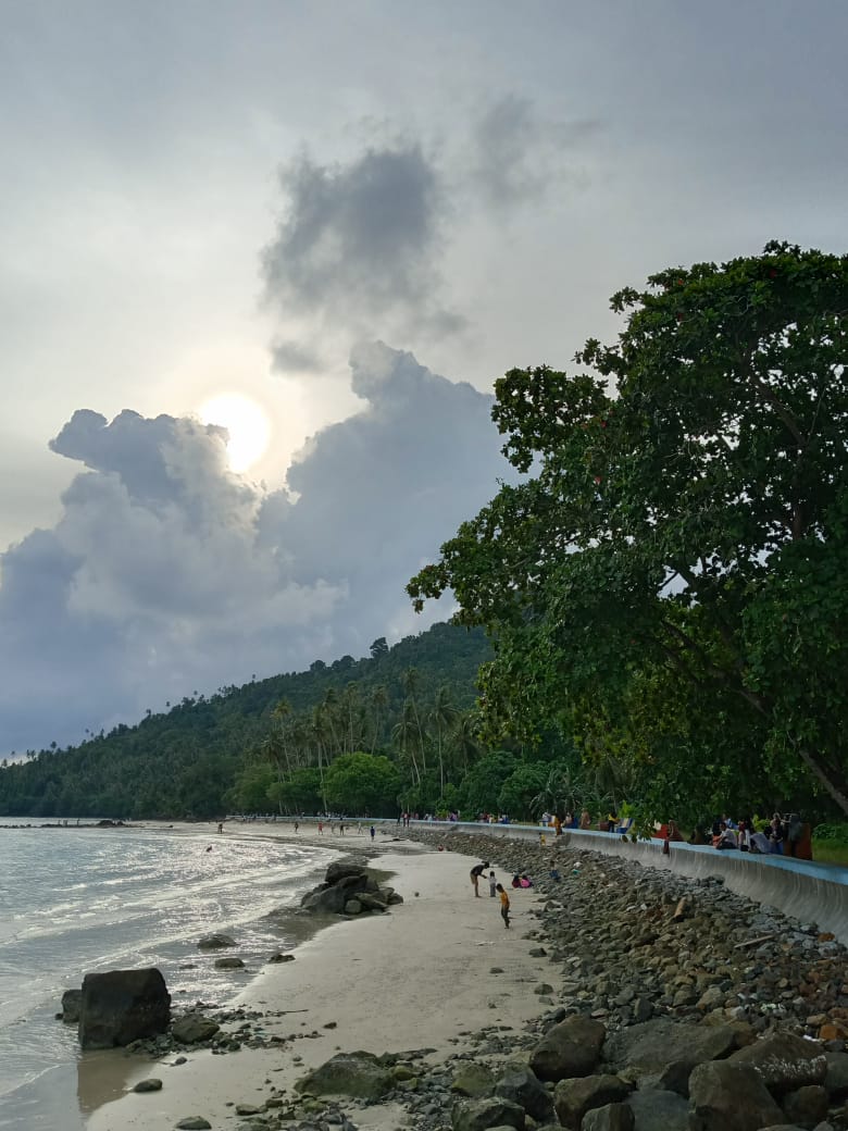 Diantara pengunjung terlihat ada yang duduk santai sambil melihat pemandangan, ada juga yang mandi di pesisir pantai