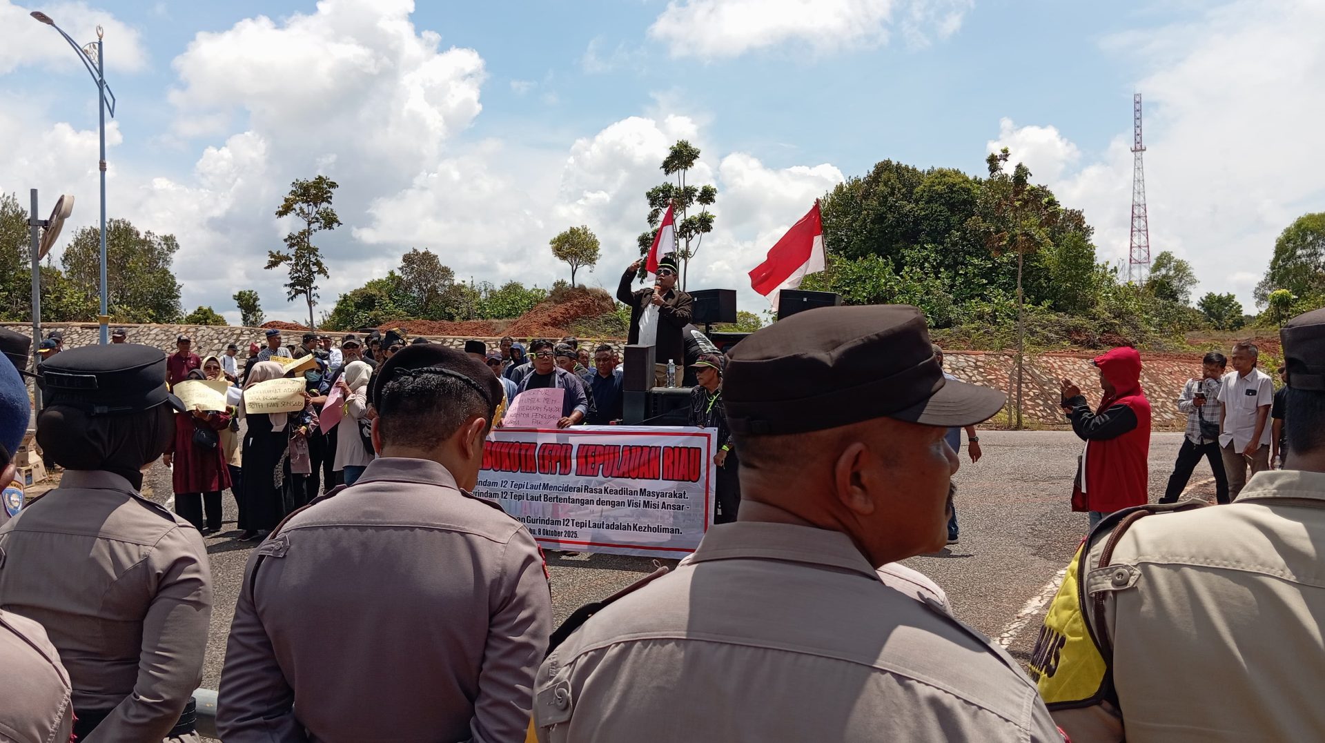 Zonakepri.com — Forum Peduli Ibu Kota Tanjungpinang (FPI) Kepri menggelar aksi unjuk rasa di depan pintu masuk Kantor Gubernur Provinsi Kepulauan Riau, Rabu (8/10/2025).