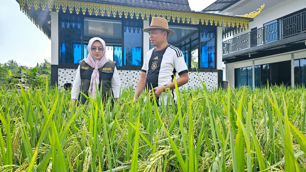 Zonakepri.com- Kepala Dinas Ketahanan Pangan, Pertanian dan Kesehatan Hewan (KP2KH) Provinsi Kepulauan Riau (Kepri), Rika Azmi meninjau tanaman padi di pekarangan rumah Bendahara Persatuan Wartawan Indonesia (PWI) Kepri di Kelurahan Air Raja, Kota Tanjungpinang, Kamis (27/3/2025).