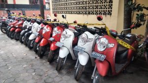 Tersangka berinisial “TZ”, Laki-laki (39) Th, Wiraswasta, dengan korban berinisial “DN”, Perempuan (24) Th, Honorer dengan barang bukti berupa 9 (sembilan) unit sepeda motor merk Scoppy, 4 (empat) unit sepeda motor merk Vario, dan 1 set kunci T.