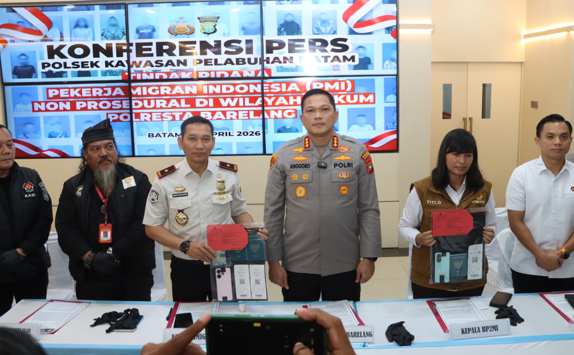 Kapolresta Barelang Kombes Pol Anggoro Wicaksono, S.H., S.I.K., M.H., memimpin konferensi pers didampingi Kasat Reskrim Polresta Barelang Kompol M. Debby Tri Andrestian, S.I.K., M.H.Li., Kapolsek Keamanan Kawasan Pelabuhan (KKP) AKP Zharfan Edmond, S.Tr.K., S.I.K., LL.M., serta Kasihumas Polresta Barelang AKP Budi Santosa, S.H., juga dihadiri Kepala Imigrasi Batam Bapak Wahyu Eka Putra, perwakilan Satgas PMI Bhakti Tuah Madani Arba Udin (Udin Pelor), serta Kepala BP2MI Ibu Indah Wulandari Situmeang, S.Pd. Senin, (20/04/2026)